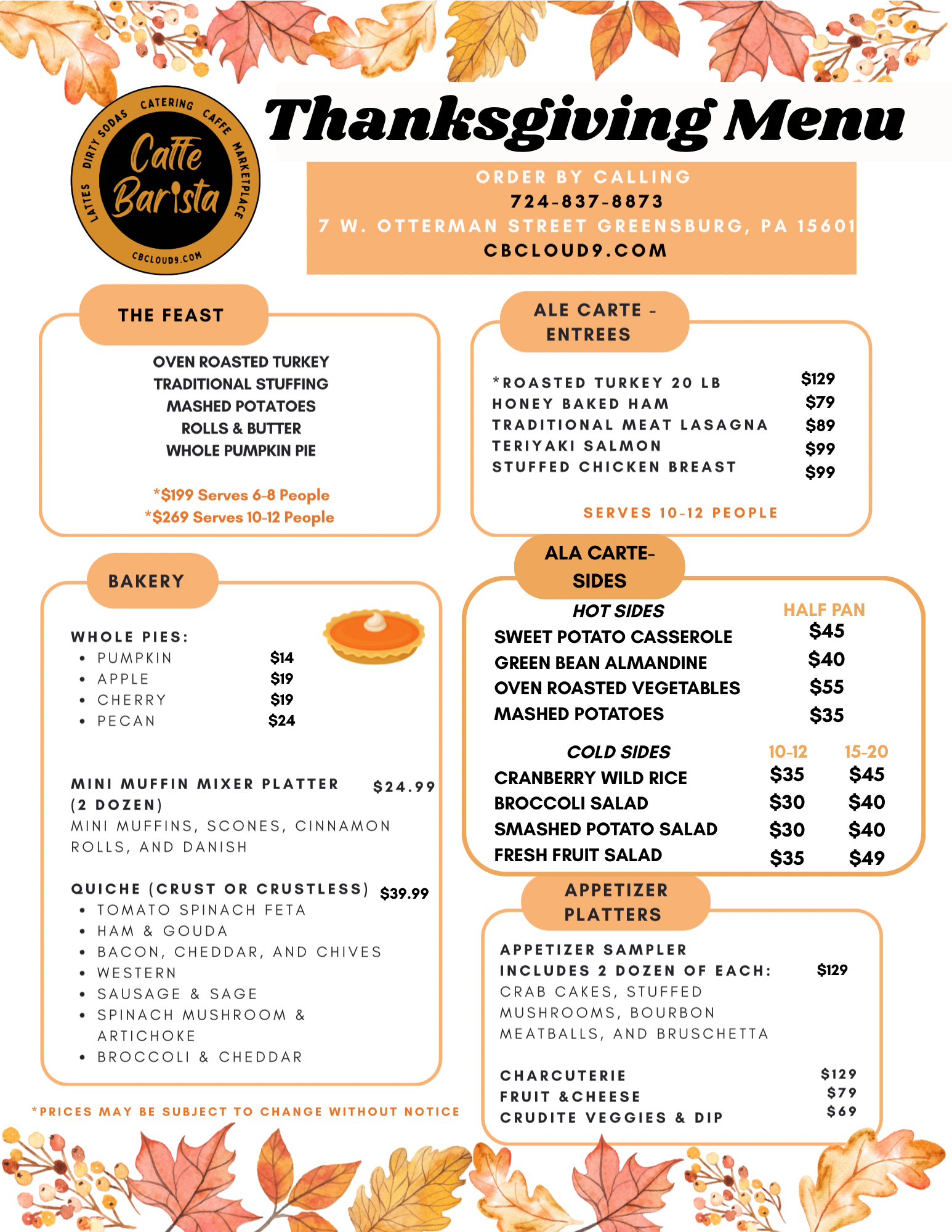 Please call 724-837-8873 to place any orders. Thank you!
